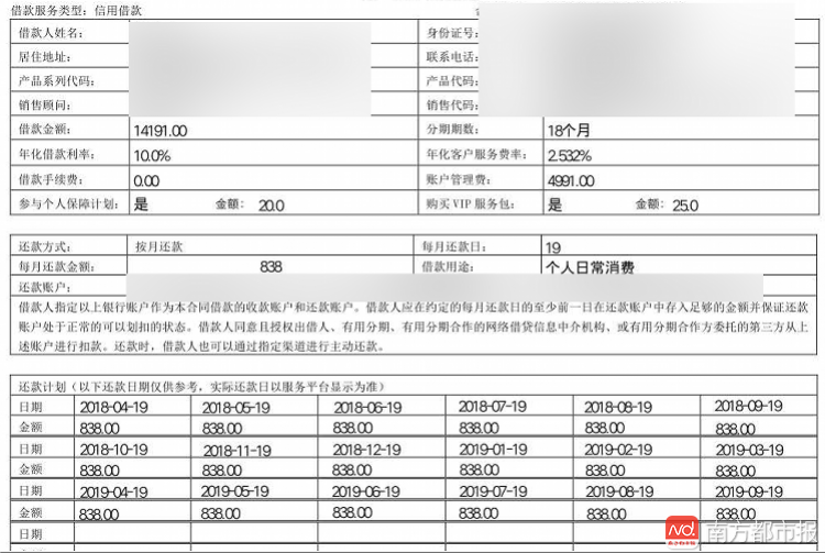 这份合同显示,上面除了"提示条款"外,还有借款金额与每个月的应还款项。合同显示,张女士的借款金额为14191元,年化借款利率为10%,账户管理费需缴纳4991元。此外,还有"个人保障计划"费用20元,以及"VIP"服务包费用25元,每个月应还款额度为838元。如果按照18个月的还款期计算,张女士拿到的这一笔贷款,其实际利率高达61%,远远超出36%的法定最高标准。
