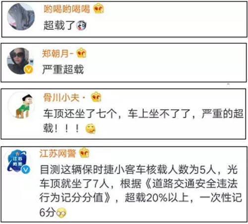 微博的图片中一辆黑色轿车车顶上坐了7只葫芦娃玩偶。很多网友看到图片的第一反应是,超载了……