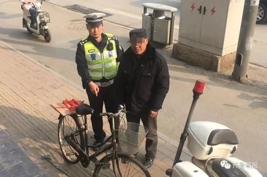 3月22日下午,济南交警大队查处交通违法时,一老人骑着自行车停到民警身边,对民警说:你看我这样行不行、行不行?
