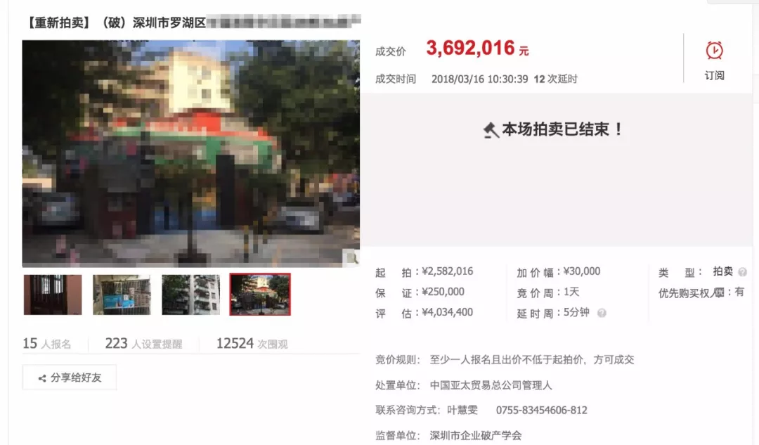 2018年3月16日10:25:39,阿奇第19轮出价,以3692016元,将罗湖区的翠华花园一处房产收入囊中,这个价格仅比前一个出价者多3万元。