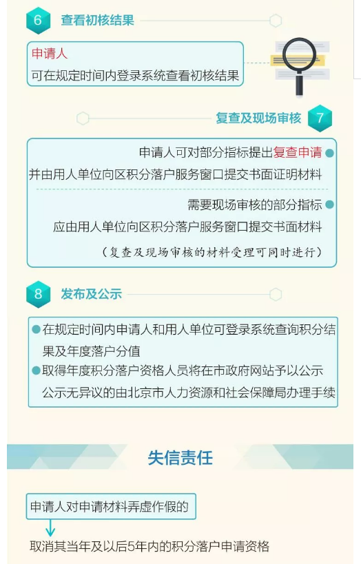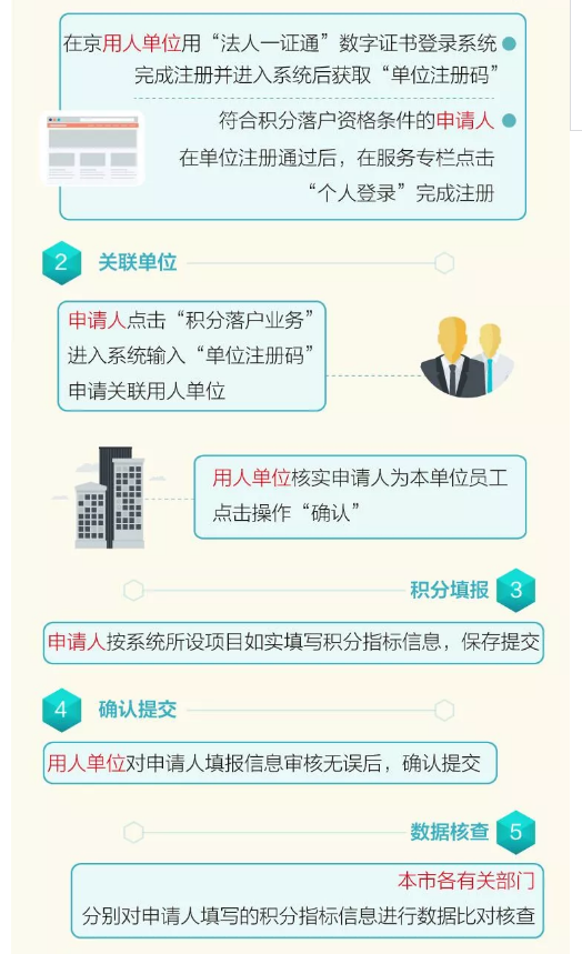 本市积分落户申报审核工作实行年度申报制,分为申报、核查、复查、公示和落户办理五个阶段,符合条件的申请人需要通过用人单位提交积分落户申请,并登录市人力社保局“北京市积分落户在线申报系统”完成注册填报。预计今年第四季度,首批通过积分获得落户资格的申请人可办理落户手续。