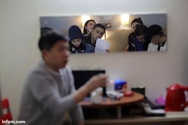 ▲网络电影《魔界时代之猫妖》在酒店选角,演员李锦豪(中)拿到半页剧本,在走廊上准备了十几分钟后,回到房间试戏。(南方周末记者翁洹/图)