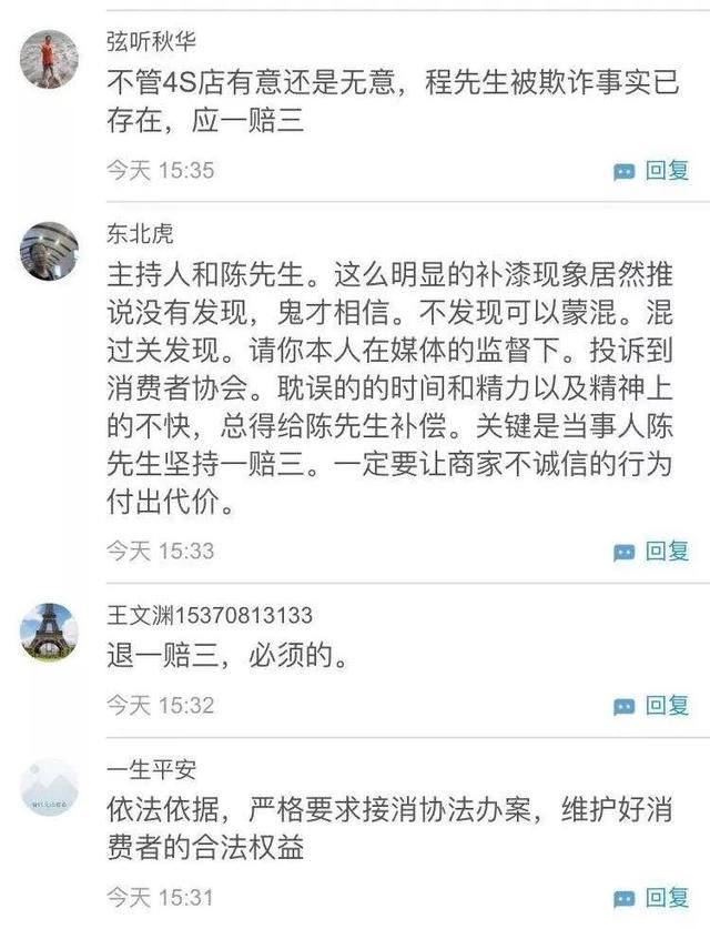 4月23日《双声道》关注此事后,一位姓薛的负责人在节目中承认,他们卖给程先生的车,确实是出过事故后经修复的车。当天程先生提车时,外面下了大雨,4S店从仓库提车过来时,受雨天影响,也没有看出来这个车有问题,因此这是4S店在不知情的情况下,将车卖给了程先生。