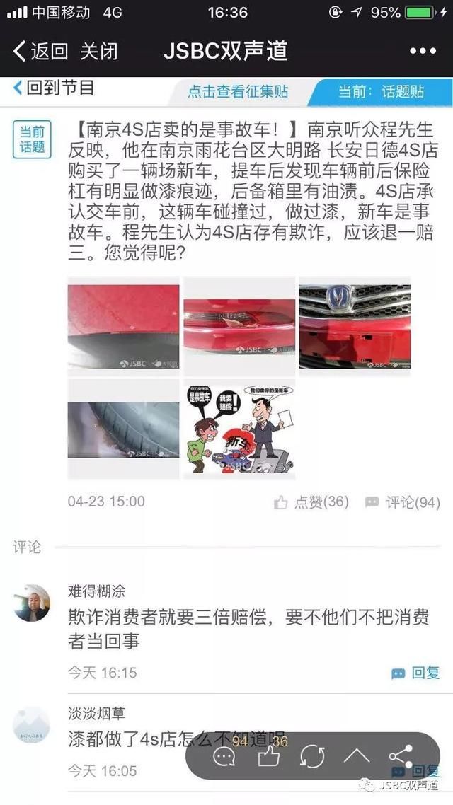《双声道》节目关注此事后,引起全省听众广泛热议和评论。在大蓝鲸LIVE平台中,5万多听众对于长安汽车日德4S店的答复表达了自己看法,大多数听众认为,4S店对于自己车辆的情况是知情的,这种明知车辆有问题仍当做新车销售的做法,涉嫌欺诈。