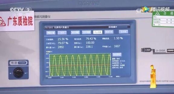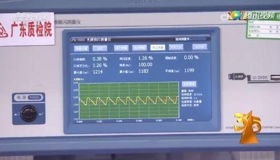 频闪,简单地说就是在一个电器的屏幕里看另一种电器的屏幕时,另一种电器的屏幕会有一条亮线从屏幕的底部推移到顶部,又从底部出现。这样无穷下去,给我们的感觉就是图像在闪烁。频闪越低,对眼睛的伤害越小。但绝对意义上的无频闪实际是不可能的,中国行业标准对合格产品的频闪要求是3125Hz。而在实验中,两台外观几乎完全相同的LED灯,在专业测试仪器下,频闪程度却相差悬殊。