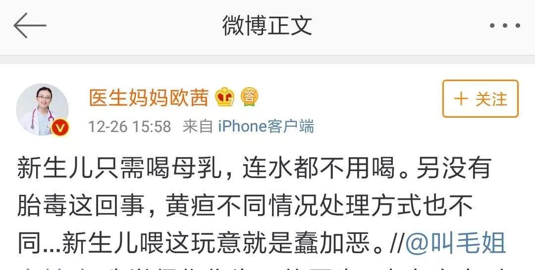 公开资料显示,欧茜为知贝儿科创始人及儿科医生、广州爱贝医疗服务有限公司及深圳市知难行易传媒有限公司等11家公司的股东。欧茜此后在微博中补充称:“新生儿只需喝母乳,连水都不用喝。另没有胎毒这回事,黄疸不同情况处理方式也不同…新生儿喂这玩意就是蠢加恶。”