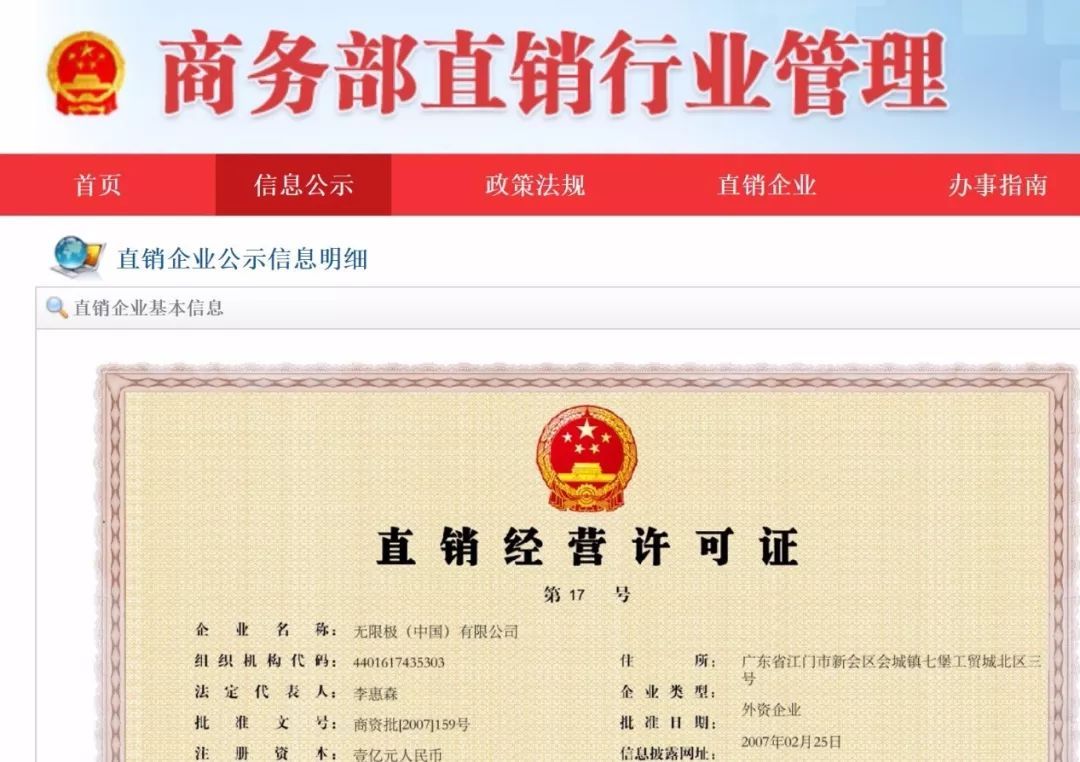 商务部直销行业管理网站显示,无限极在2007年,也就是国内开放直销市场后的第三年拿到直销牌照。第三方数据研究机构海伦国际直销研究中心发布的《2017年中国直销企业业绩报告》显示,就业绩而言,无限极、完美、安利三家外(港)资直销企业依然名列行业前三甲,营收分别达到213亿元、200亿元与200亿元。无限极业绩比目前处于风口浪尖、位列第四的权健多出63亿元。