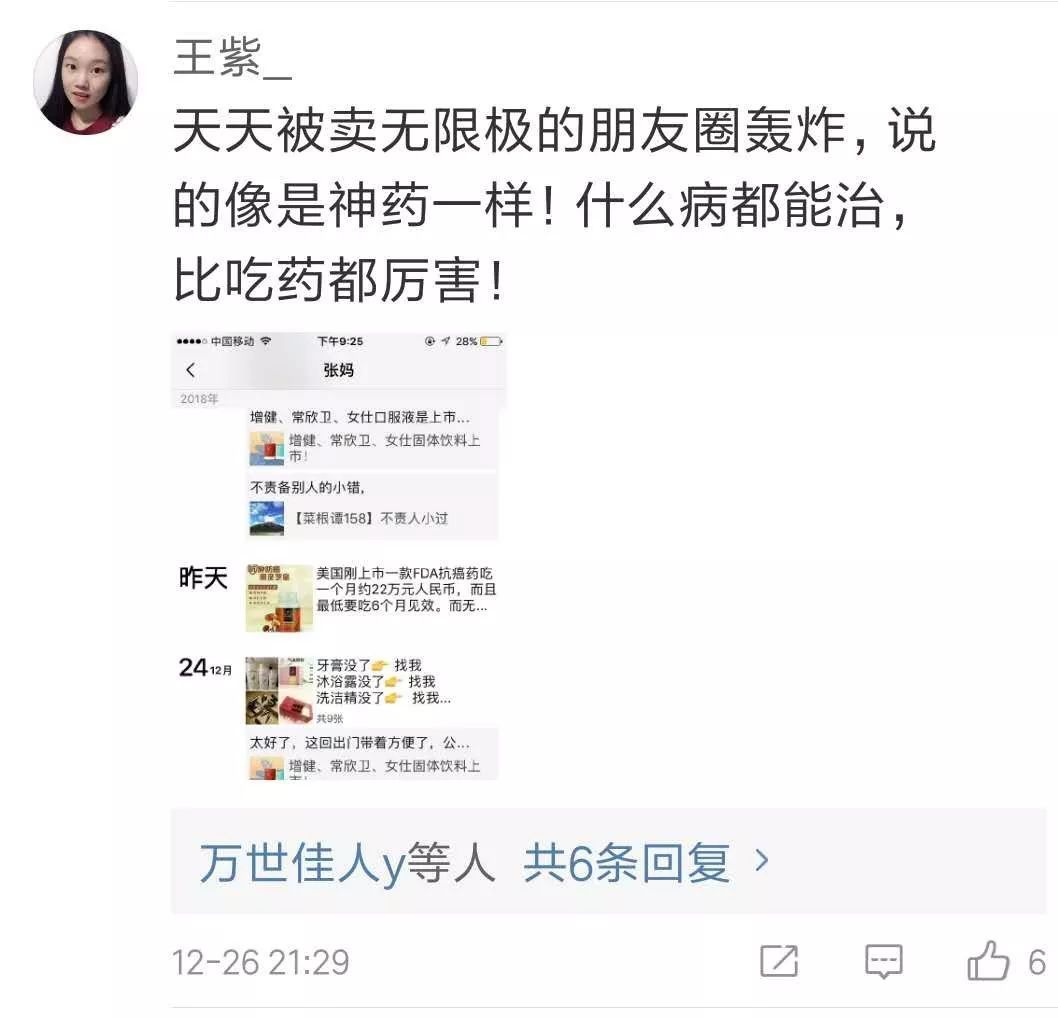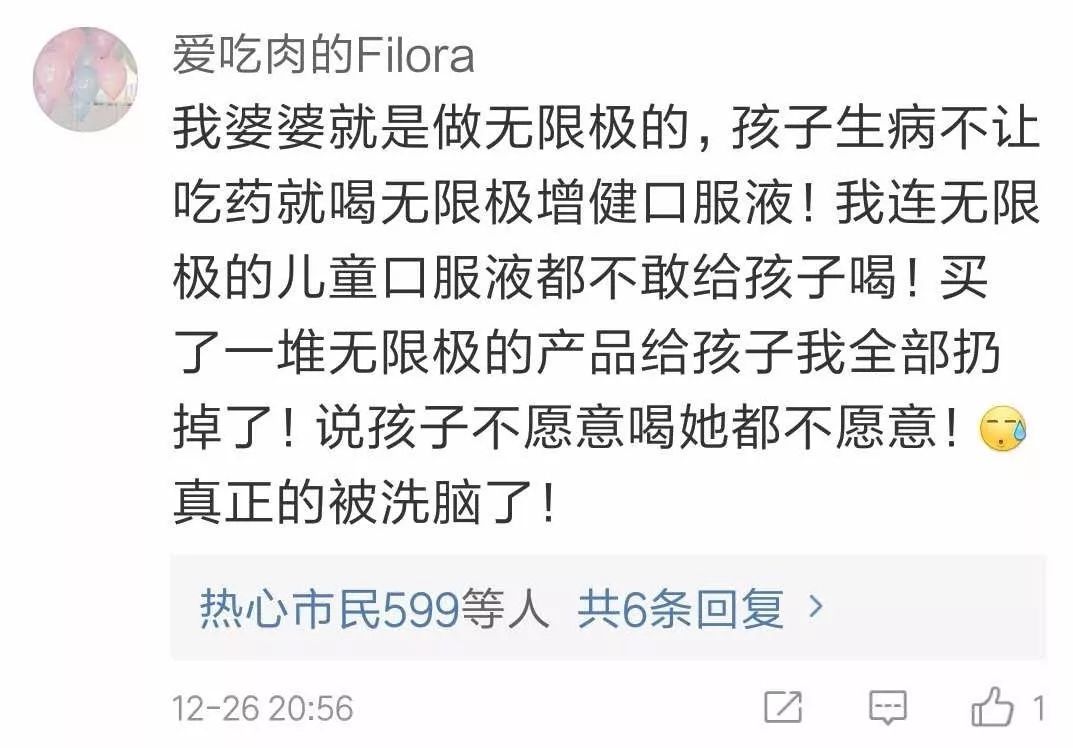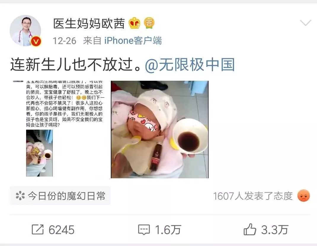 12月26日,一位在微博上被认证为儿科医生大V的博主“医生妈妈欧茜”发文称:“连新生儿也不放过”。配图疑似为欧茜截下的无限极销售人员的朋友圈信息:“宝宝刚出生就可以喝增建口服液了,可以去黄,可以解胎毒,还可以预防感冒引起的肺炎……我们无限极人的孩子也是宝贝啊,如果不安全我们的宝妈会让孩子喝吗?”
