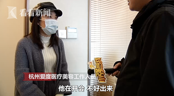 杭州爱度医疗美容工作人员:“他在开会,不好出来。因为我这边是行政,不是主管或者咨询,所以我不太清楚这个事情我只能告诉你,我会上报上去,让他们尽快帮顾客解决。”