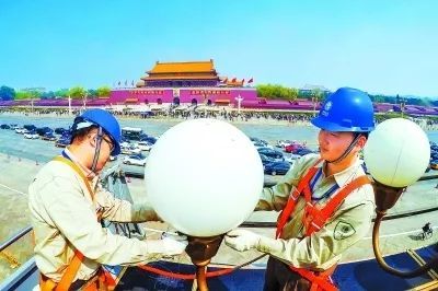 为了让天安门广场和长安街展现最佳风采,每年的5月到9月,“华灯班”工人都要顶着烈日擦洗华灯。