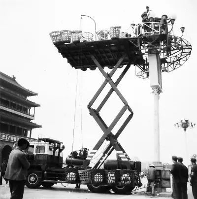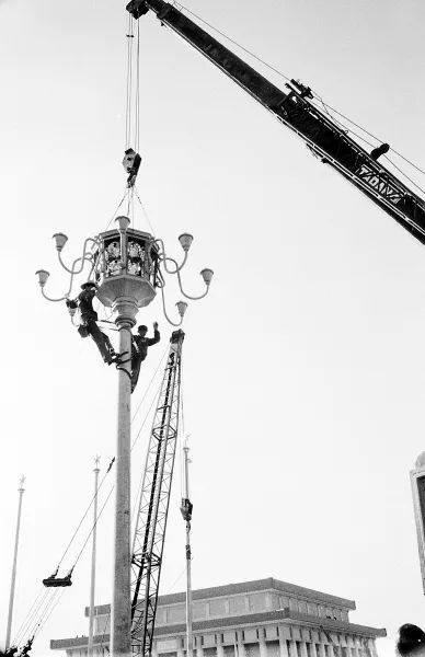 为了在1959年国庆前正式启用,华灯项目紧张施工。“那时我们把工程叫‘会战’,既没有专业分工,也基本没有专业化设备,全路灯队上上下下不到100人集体出动,靠手拉肩扛完成施工任务。”今年82岁高龄的王庆余老师傅记忆犹新,1956年他进入北京供电局工作,见证了华灯的施工;从1960年开始,由北京供电局负责华灯的清扫检修工作,他也正式进入华灯班,成为第一代“掌灯人”。