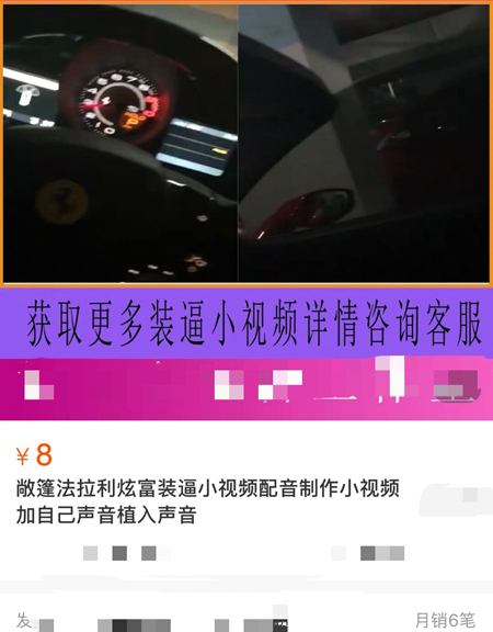 现代快报记者在某电商平台搜索 " 炫富 " 关键词,找到了不少正在销售炫富视频的卖家。在一个名叫 " 天天微商营销工作室 " 的店铺,有各种各样的炫富视频可供挑选,如宾利、兰博基尼等豪车视频,内容是这些豪车的内饰和启动过程,还有一些飙车的画面。另外还有一些海外旅游的视频,内容多数是拍摄的一些国外高档酒店、豪宅等。视频售价统一为 8 元,如果有特殊需求,还可以和客服联系。记者以买家的身份和店家进行了交谈,店家称,为了让视频更加真实,他们可以帮客户在发布视频时,添加海外坐标的定位,但是需要他们登录客户本人的微信账号。