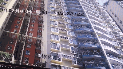视频显示,14时42分20秒,两个物体高速坠下,一位正好行经路口的男子被吓的定住了脚步,而一位正蹲在2箱8栋楼下的男子也被惊吓的站起来。