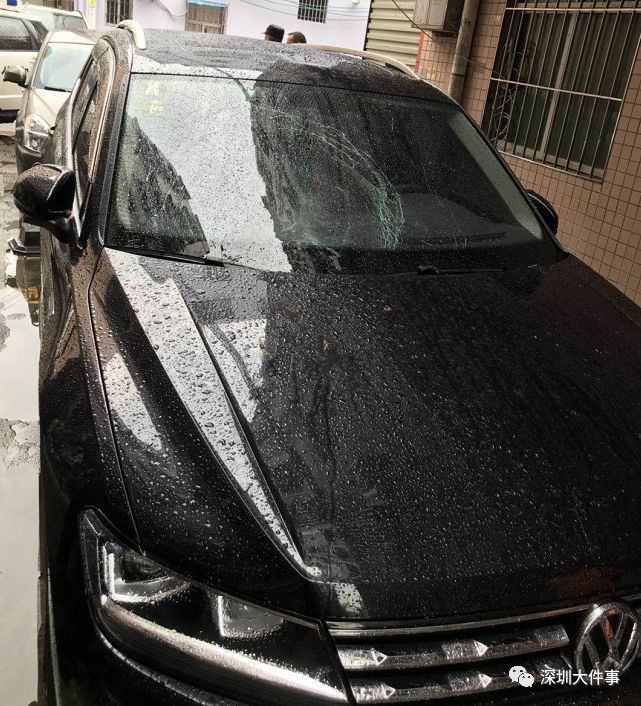 7月11日下午2点42分,龙岗区宝龙小区一巷6栋与二巷8栋之间巷口处,一辆黑色的大众牌轿车被楼上掉落的一只宠物狗和一块带框的镜子砸中前挡风玻璃及车头盖,车玻璃损坏严重。