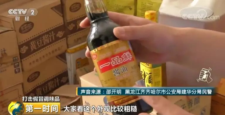 黑龙江齐齐哈尔市公安局建华分局民警 邵开明:对39个品类进行抽检,经过检验中心检测都是不合格产品,一箱酱油的成本,包装和箱子加原材料,成本在5、6元,非常低,但是可以卖到20、30元。