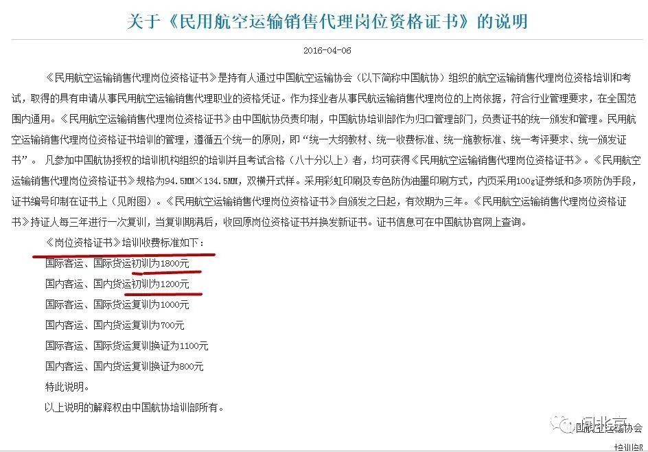 记者又根据李女士领到的证书查询到了 中国航空运输协会官网,发现民用航空运输销售代理企业的各类从业人员, 确实要取得《民用航空运输销售代理业务岗位资格证书》,但是要经过 航协认可的培训机构或单位培训,航协还规定了岗位培训的收费标准,写明的 各项收费都不超过2000元,按照规定机构不能提高或者降低。