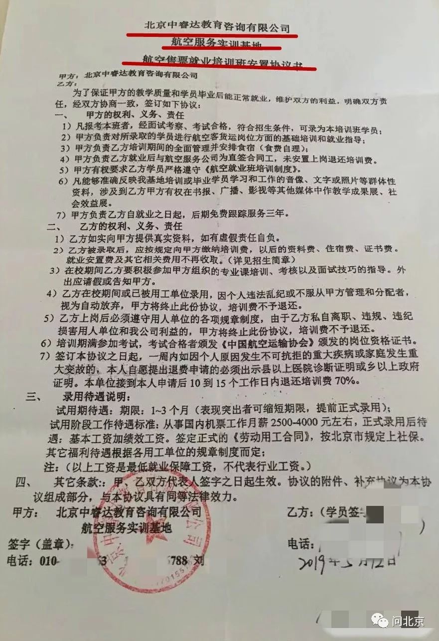 但她们都没能如愿。虽然来自不同的地方,但公司收取费用后都把她们送到了一家叫做:“ 北京中睿达教育航空服务实训基地”的机构,机构表示会在 培训结束后给他们发放民用航空运输销售代理岗位技能培训合格证, 保证他们就业。