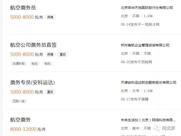 某招聘网站上显示的航空票务招聘信息/受访者供