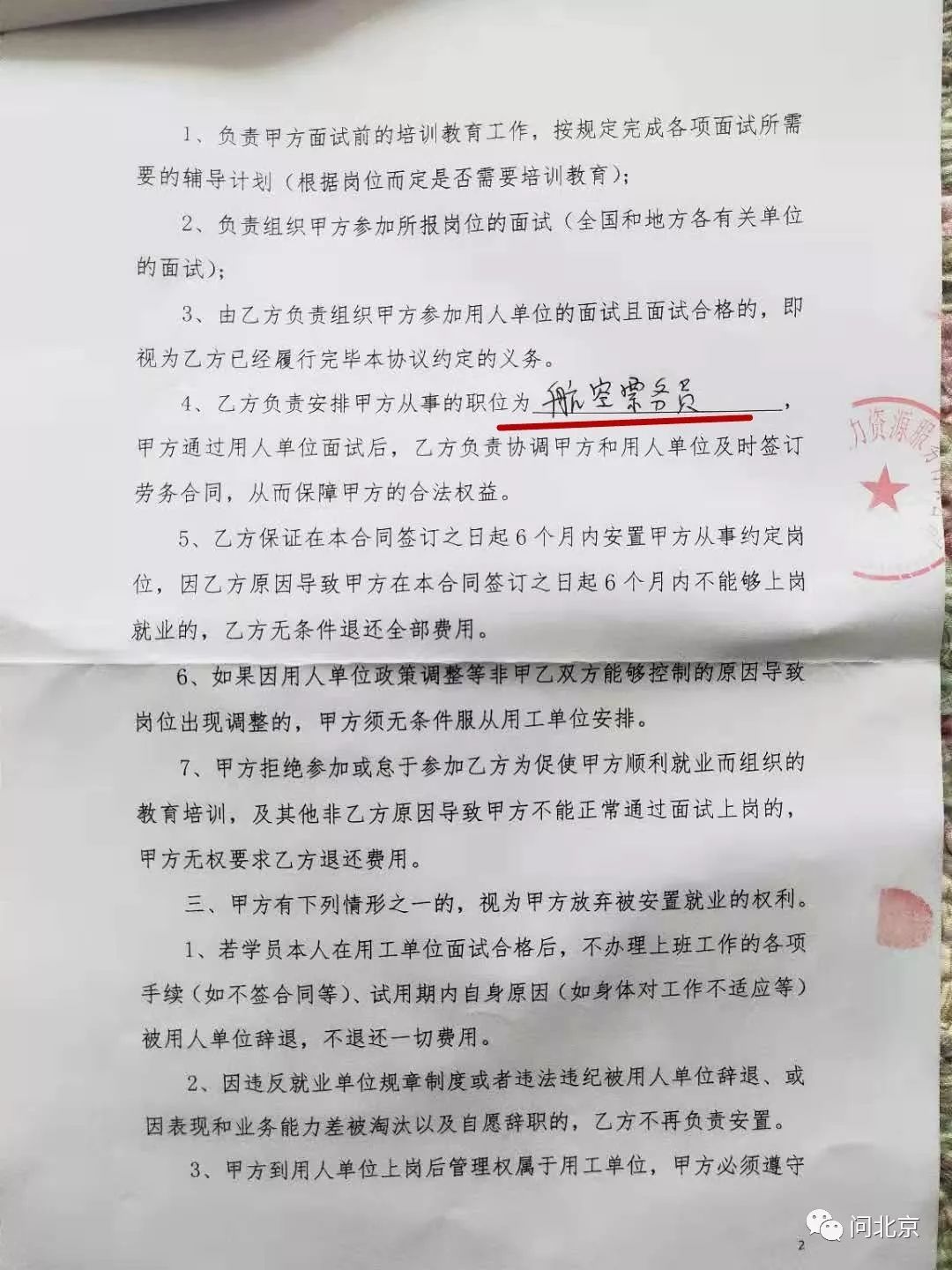 李女士(化名)今年25岁,是河北人,去年12月份,她和河北圆众人力资源服务有限公司签署了 委托培训就业协议书,缴纳了 33000元的费用,公司的工作人员向她承诺经过 短暂的培训后就可以安排到机场或者航空公司工作。李女士说: