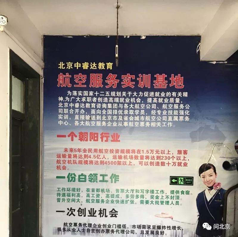 8月15日,北京新闻广播记者以学生的身份来到了这家位于石景山区的培训机构探访,机构在 石景山区古安路一个院内。院子门口挂着“ 民航国内国际客运实训基地”的牌子,楼里张贴着 北京中睿达教育航空服务实训基地的海报。