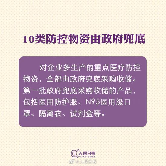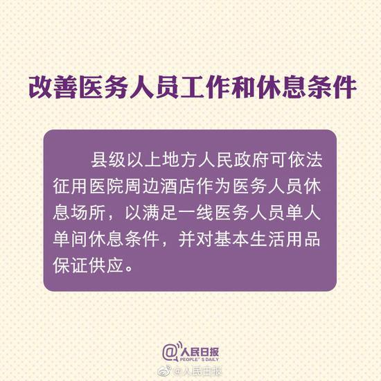 ①县级以上地方人民政府可依法征用医院周边酒店作为医务人员休息场所;②10类防控物资由政府兜底;③#助学贷款受疫情影响可延期#;④疫情防治临时性工作补助和奖金免征个税;⑤#企业要为职工配发口罩#等防护用品……