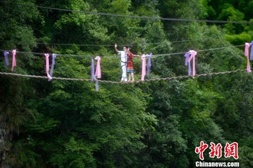 资料图:重庆100米悬崖上15对情侣"鹊桥"牵手过"七夕"。陈超 摄