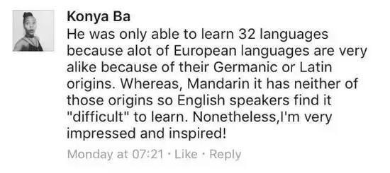 “他能学会32种语言,是因为很多欧洲国家的语言很相似,都是源自日耳曼语系或者拉丁语系。但是,中文有着完全不同的起源,所以对于说英语的人来说,它确实很难学。不过无论如何,我很敬佩他,他也给了我很多启发。”