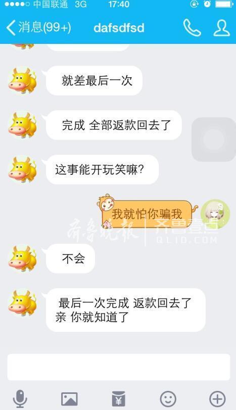 王女士和对方的QQ聊天记录。对方信誓旦旦地称自己不会骗人,最后完成就会返款回去。 记者 唐园园 摄