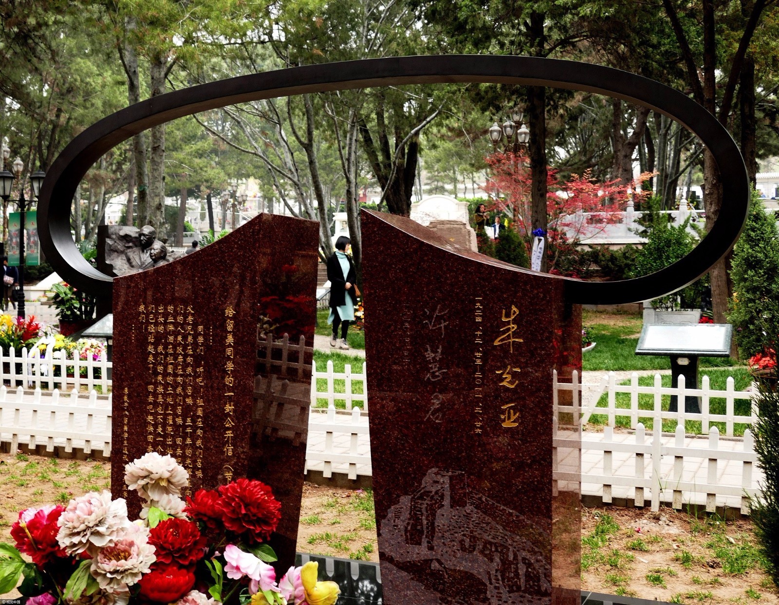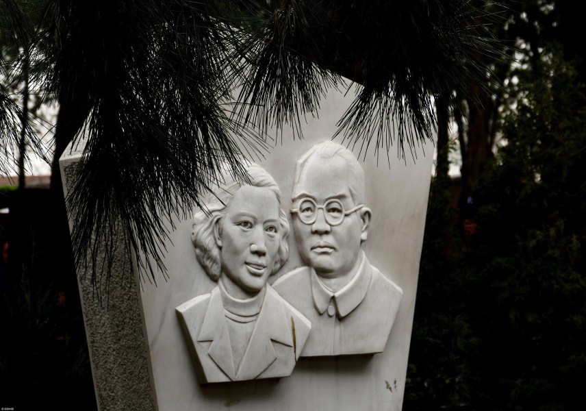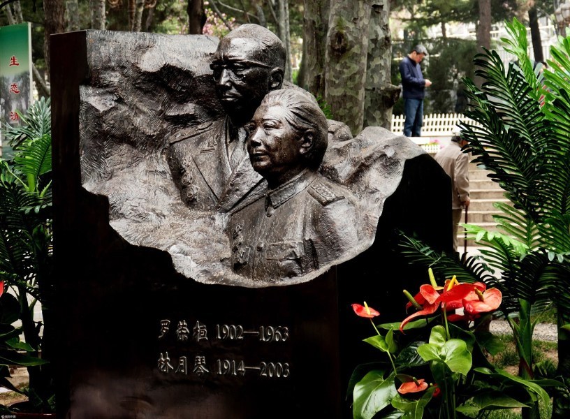 2017年4月4日,清明节。在北京八宝山革命公墓扫墓的人们渐渐发现,昔日传统规格的墓碑群里,呈现出墓碑个性化、艺术化的墓碑来,给前来瞻仰、扫墓的人们,在缅怀的同时,还欣赏一下雕塑艺术作品。图为2017年4月4日,北京八宝山革命公墓,罗荣桓、林月琴夫妇墓碑雕塑造型。 图片来源:视觉中国