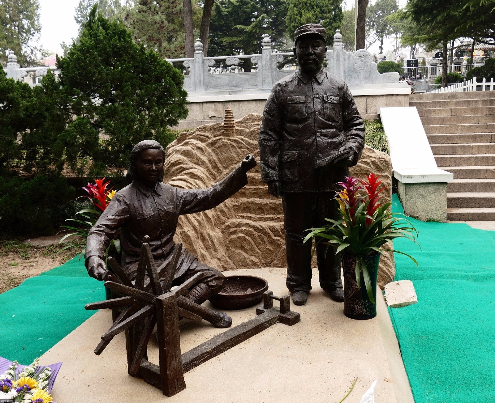 图为2017年4月4日,北京八宝山革命公墓,一组延安革命生活的雕塑墓碑,吸引人们的目光。 图片来源:视觉中国