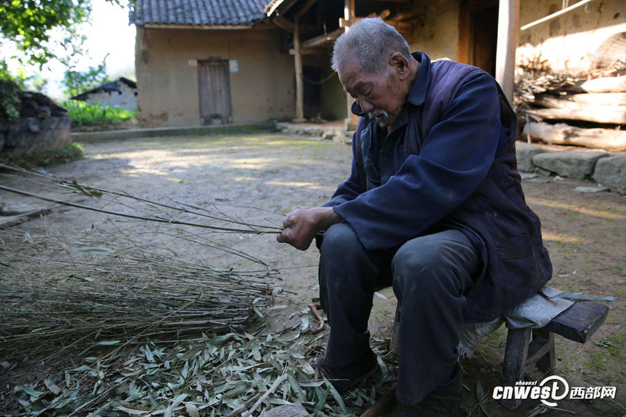 5月23日,陕西省汉中市宁周家坎村半山腰上,106岁的老寿星王春云在土坯房前将一根根竹枝上的叶子摘掉摆放整齐准备绑扫把。老人生于1911年9月8日,已是六代同堂,但他不想和儿孙们生活在一起,独自一人料理自己的生活。干农活、做饭、下河洗衣、赶集、喝酒、唱山歌……有滋有味乐享每一天。