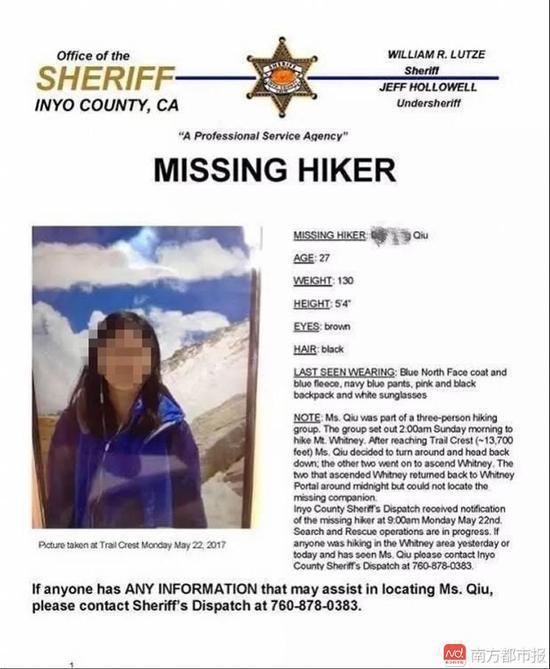 此前,因约县警方发布的寻人通告显示,该留学生与两位友人前几天组队到惠特尼峰徒步登山。当地时间5月21日凌晨两点,她和队友登山至惠特尼峰山脊步道时,决定返回原来的小道路口。之前团队里一位女队员已经返回,剩下一位男队员独自登山。5月21日午夜,男队员返回到小道路口时候,两人发现她已经失联,并于5月22日上午9时左右报警。
