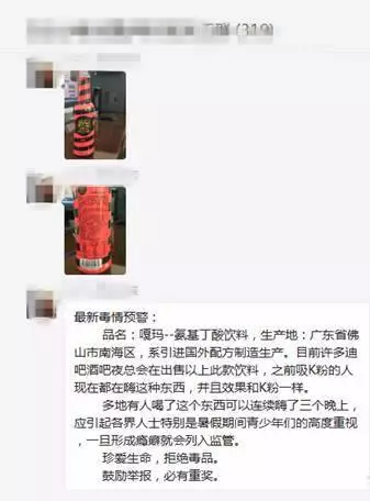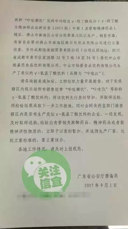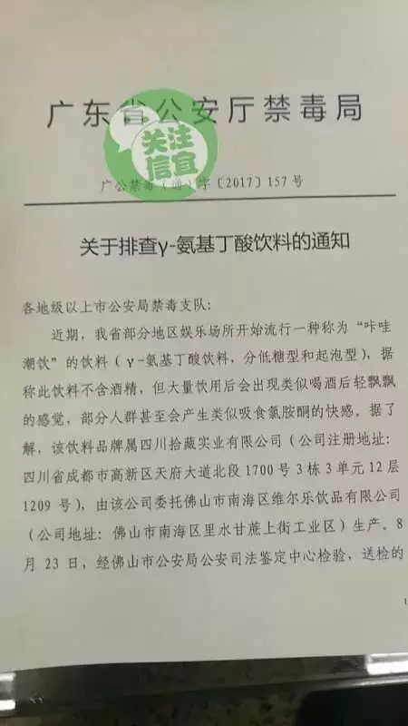 广东省公安厅禁毒局的文件《关于排查Y-氨基丁酸饮料的通知》,其中一段写到:近期,我省部分地区娱乐场所开始流行一种称为“咔哇潮饮”的饮料(Y-氨基丁酸饮料,分低糖型和起泡型),据称此饮料不含酒精,但大量饮用后会出现类似喝酒后轻飘飘的感觉,部分人群甚至产生类似吸食氯胺酮的快感。