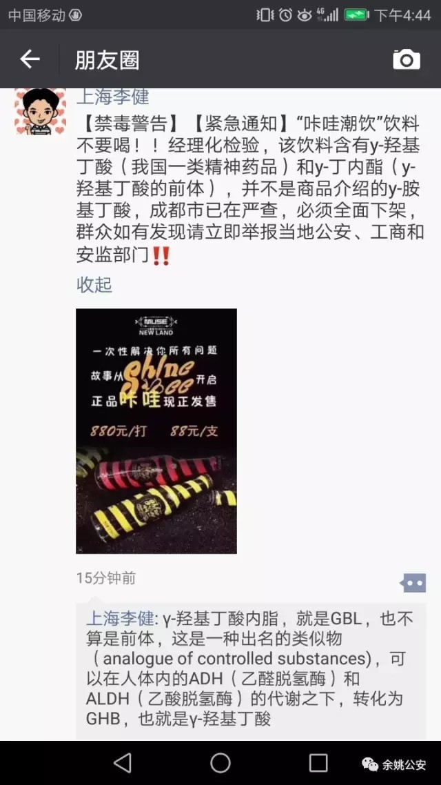 为此,余姚公安发布禁毒预警:“咔哇”饮料不要喝!!经理化检验,该饮料含有y-羟基丁酸(我国一类精神药品)和y-丁内酯(y-羟基丁酸的前体),并不是商品介绍的y-胺基丁酸,属于新型毒品!